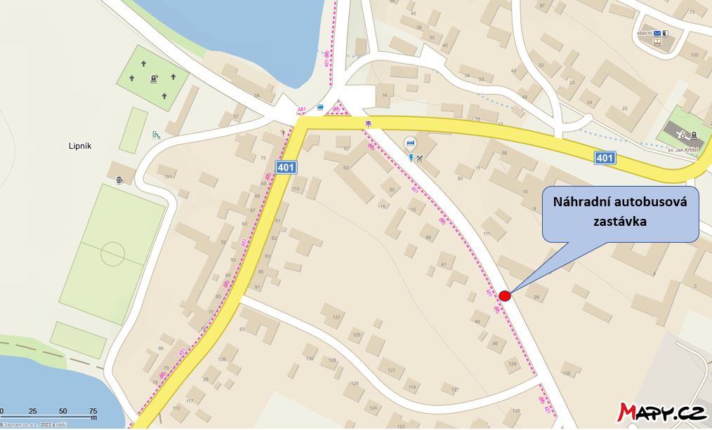 Upozorňujeme, že po dobu provádění prací na rekonstrukci křižovatky bude náhradní autobusová zastávka umístěna u obecní stodoly (viz. mapka)