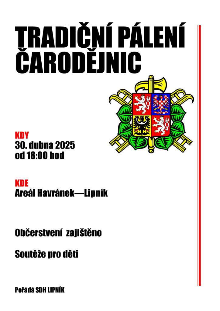 SDH Lipník Vás zve na tradiční pálení čarodějnic, které se uskuteční dne 30.4.2025 od 18 hod v areálu Havránek. Připraveny budou soutěže pro děti. Občerstvení zajištěno. Na Vaši účast se těší pořadatelé.